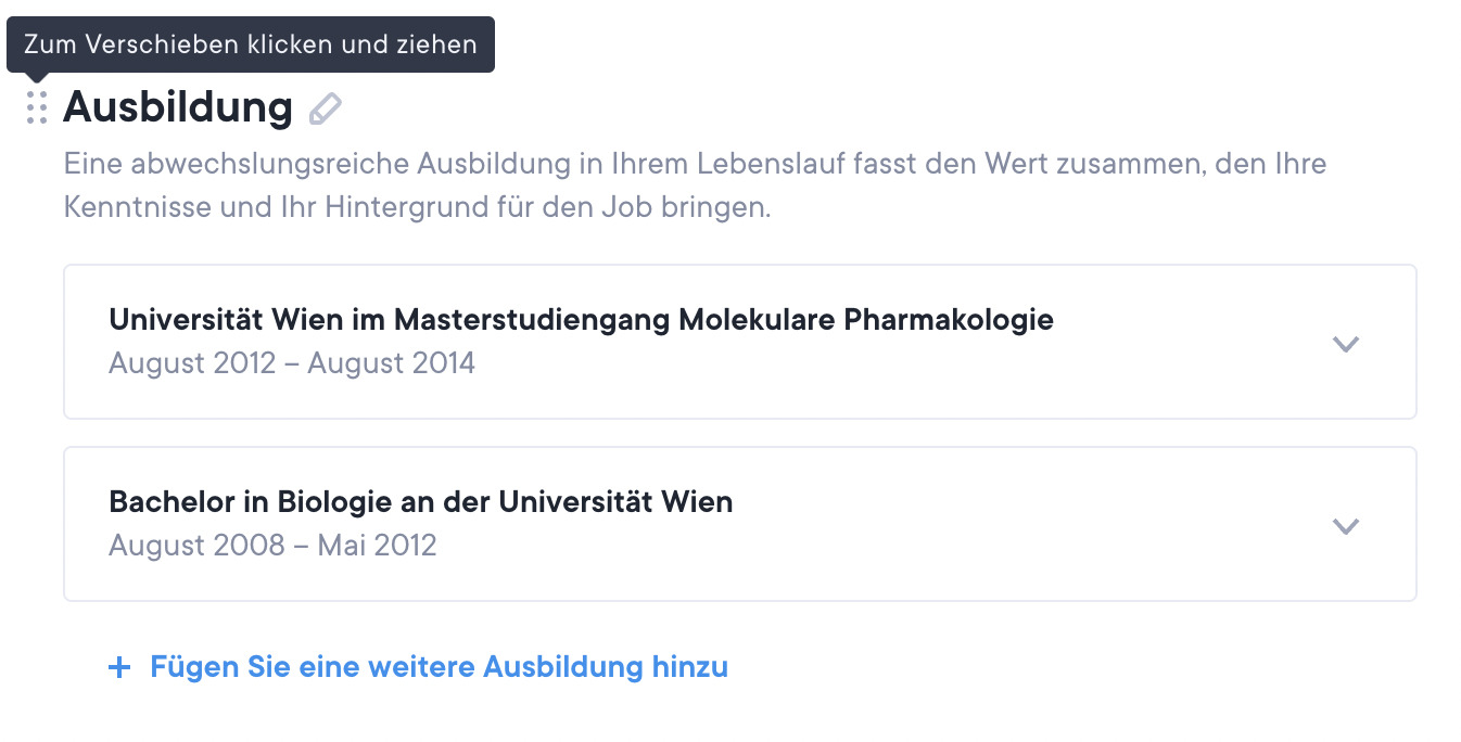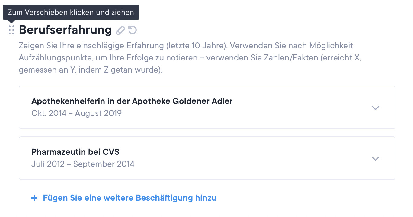 Abschnitte neu anordnen – du kannst jeden Abschnitt unter der Zusammenfassung im Hauptteil des Lebenslaufs neu anordnen. Um einen Abschnitt neu anzuordnen, klicke auf das Gittersymbol links neben dem Abschnitt, wie unten dargestellt. Daraufhin kannst du die Abschnitte nach oben oder nach unten ziehen. Siehe Screenshots unten.