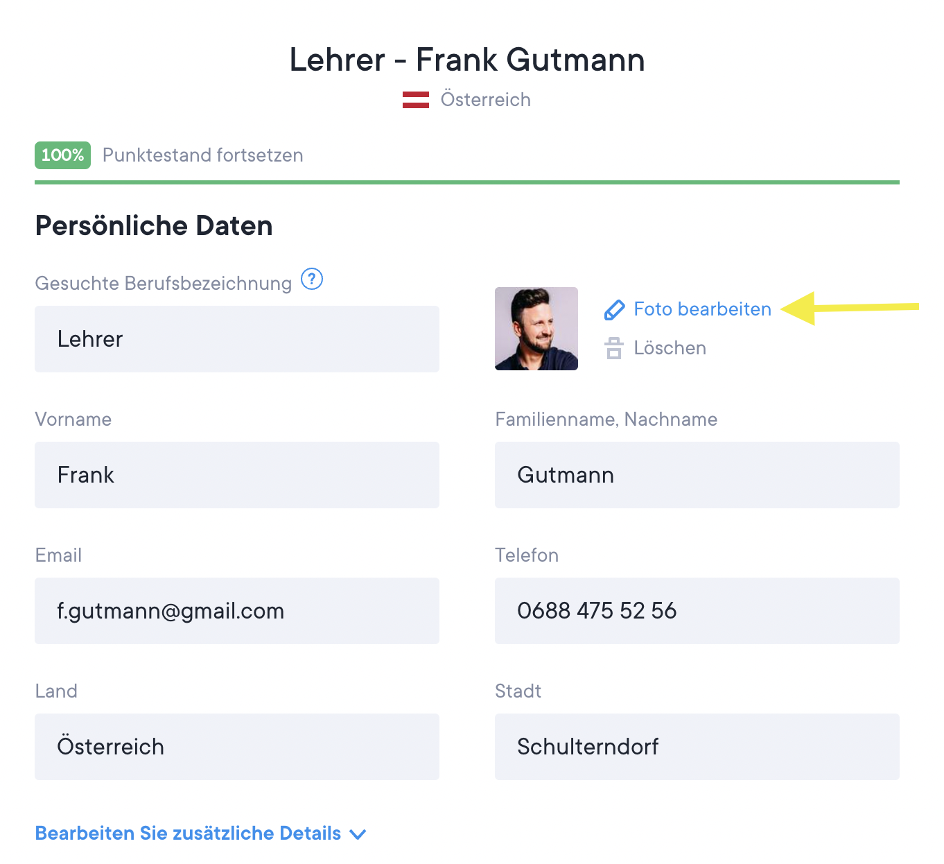 Im Abschnitt Persönliche Angaben hast du die Option, ein Foto hochzuladen. Siehe Screenshot unten.