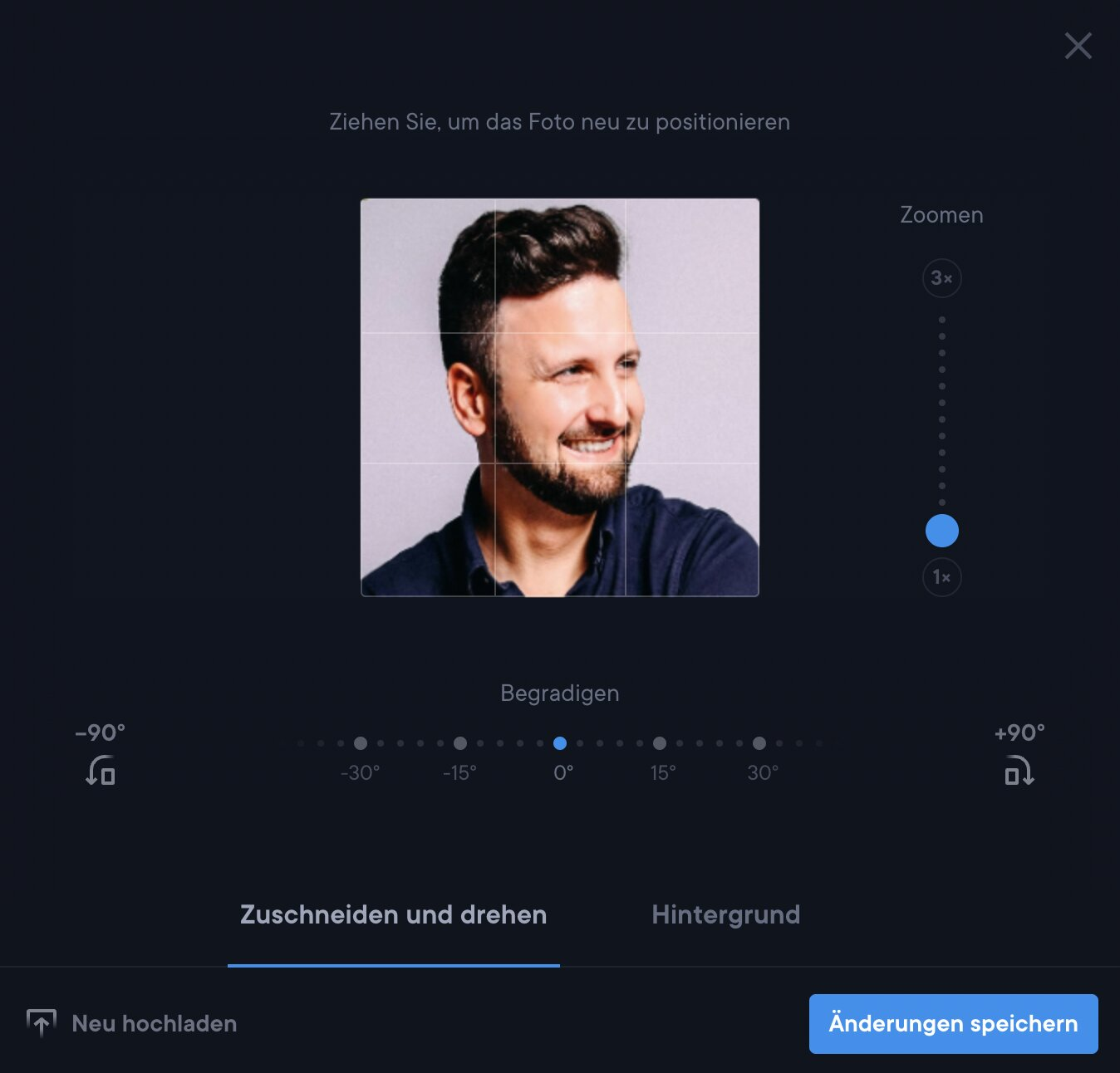 Das ideale Foto im Lebenslauf ist ein viereckiges Portrait mit einem 1:1 Verhältnis und mindestens 600 × 600 Pixeln. Nachdem dein Foto hochgeladen wurde, stehen dir erneut einige Optionen zur Bearbeitung zur Verfügung. Siehe Screenshot unten.