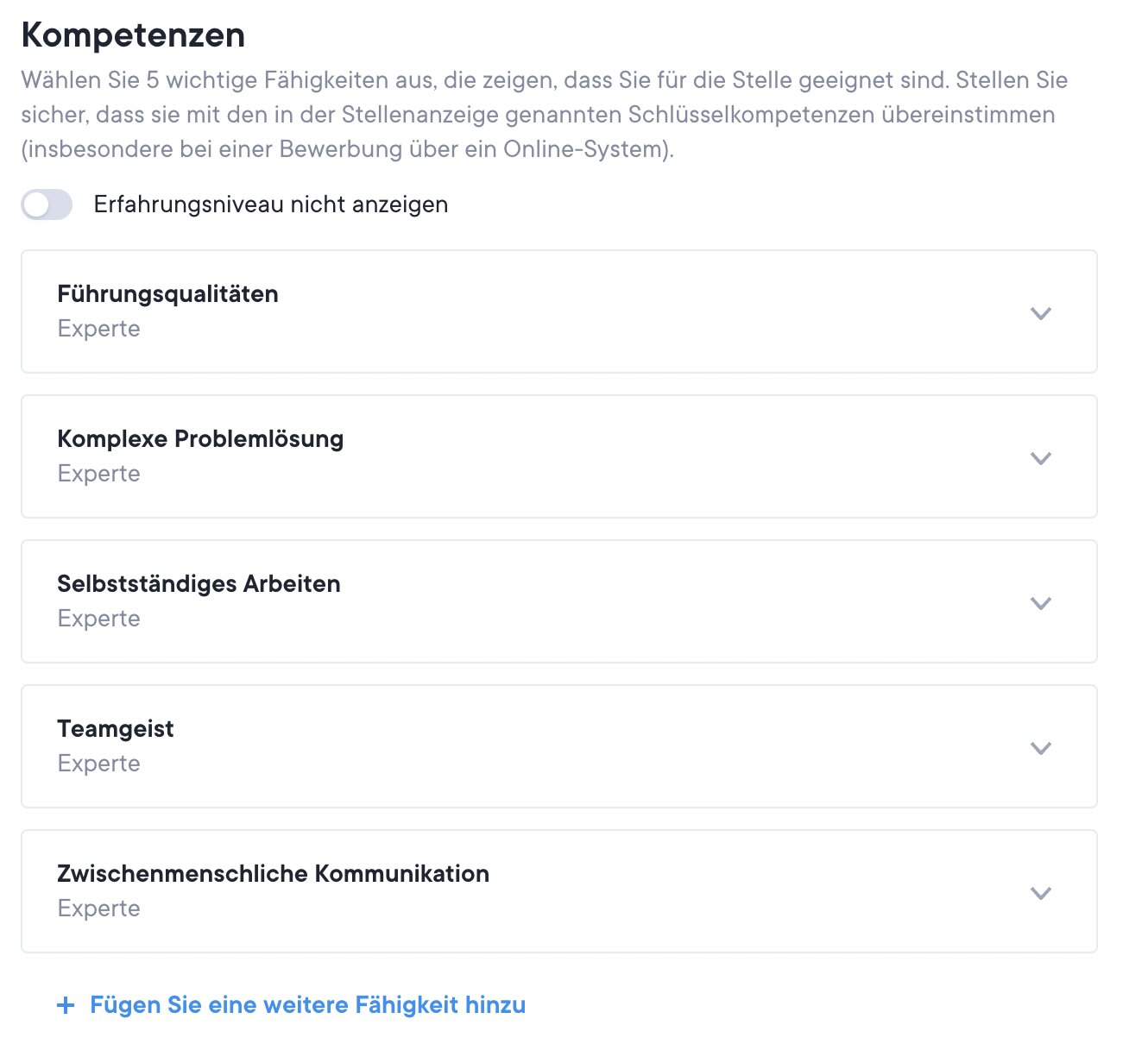 Die Kompetenzen, die zum Beispiel ein Vertriebsleiter hinzufügen könnte, wären: Vertrieb, CRM, Verkaufsentwicklung, Vertriebsmanagement, Salesforce, Pipeline etc. Suche in unserer Bibliothek nach Lebenslauf Mustern, und finde für deine Branche typische Kompetenzen.