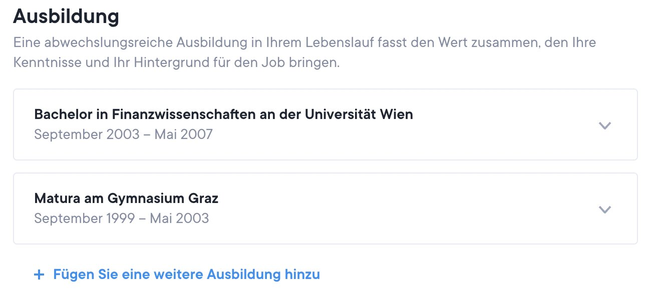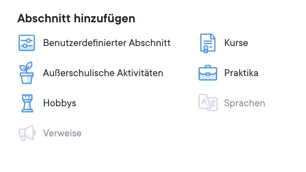 Unten im Editor gibt es einige optionale Abschnitte, wie Kurse, Referenzen, Sprache, Freizeitaktivitäten und Praktika.