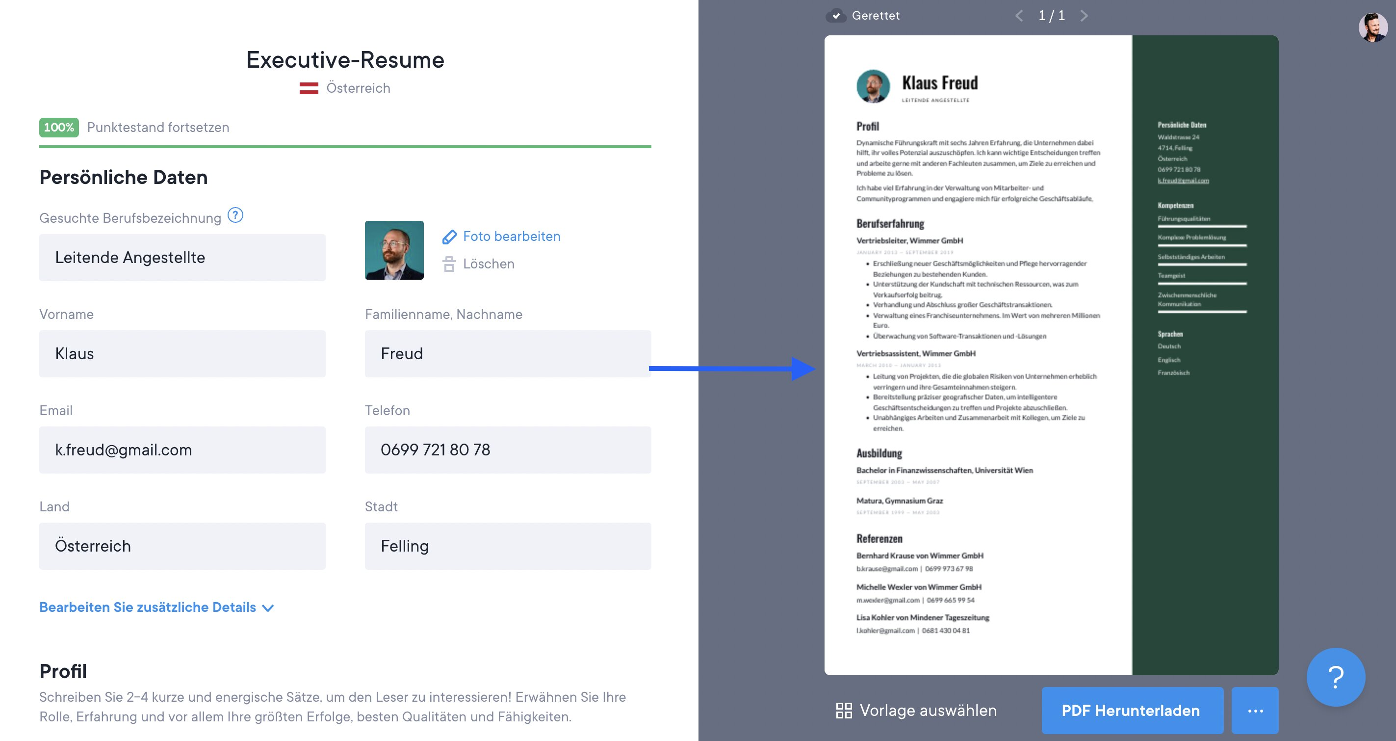 Nachdem du zu deinem Lebenslauf und Bewerbungsschreiben neue Inhalte hinzugefügt hast, kannst du dein Dokument in den Vorlagen zu jedem Zeitpunkt über die Vorschau ansehen. Deine Änderungen werden in der Vorschau in Echtzeit wiedergegeben.